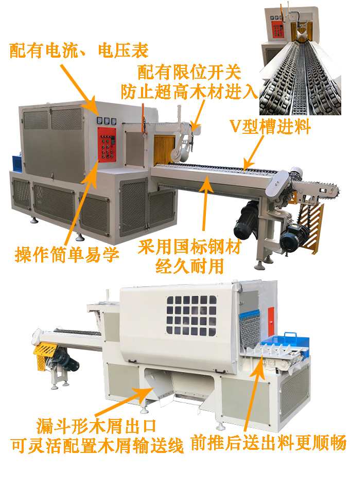 送 料:采用四排尖齒鏈條輸送,機上配有變頻智能調速器,可以對大小木料的進料速度實行自由調速。原木可以實現自動分中,機上還配有限位開關,防止超去規格木料進入,防止卡木避免對機器造成損壞。