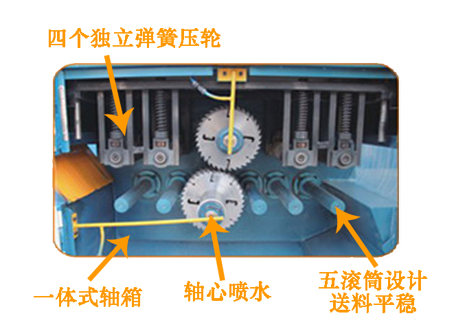 2.上壓料裝置采用四個(gè)獨(dú)立彈簧壓輪,同時(shí)具有容易調(diào)節(jié)加工厚度,運(yùn)行穩(wěn)定,故障率低的優(yōu)點(diǎn)。