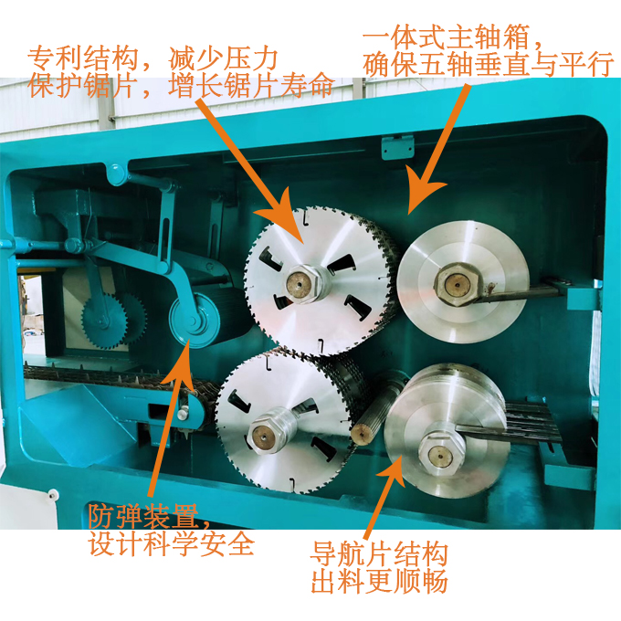 ZQ400型原木多片鋸是針對原木鋸切而設計的專用機床,其主要特點與性能:帶自動進料架,自動出料架、可自動進料、自動對中、自動出料,極大提高效率降低人力成本。采用五軸結構設計-前鋸后導航確保木板的精確度,無論木板長短均可保證鋸切木材尺寸公差在0.2mm-0.5mm之內,尺寸標準偏差小,節約木料,上下鋸軸,鋸片采用進口帶刮刀鋸片,鋸切表面光滑,無需再刨,保證不燒鋸片。采用自動分中裝置,提高木材的利用率;上壓輥主動增加壓力,送料平穩;軸心噴水冷卻鋸片,去脂降溫,增強鋸片的使用壽命。一次多片,大大提高工效;