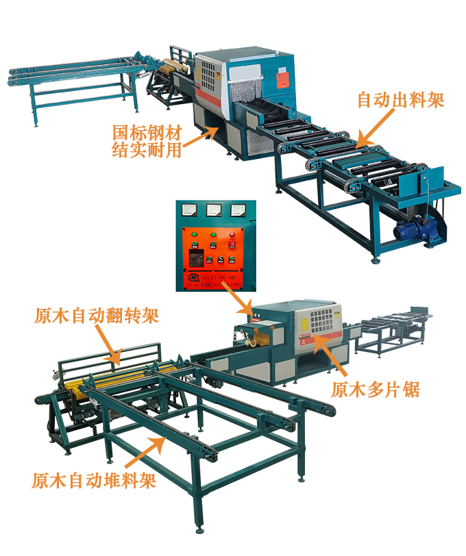 ZQ350型全自動原木多片鋸是針對原木鋸切而設計的專用機床,其主要特點與性能:帶自動進料架、自動出料架、自動翻料架,可自動進料、自動對中、自動出料、自動翻料,極大提高效率降低人力成本。采用五軸結構設計-前鋸后導航確保木板的精確度,無論木板長短均可保證鋸切木材尺寸公差在0.2mm-0.5mm之內,尺寸標準偏差小,節約木料,上下鋸軸,鋸片采用進口帶刮刀鋸片,鋸切表面光滑,無需再刨,保證不燒鋸片。采用自動分中裝置,提高木材的利用率;上壓輥主動增加壓力,送料平穩;國內首創,軸心噴水冷卻鋸片,去脂降溫,增強鋸片的使用壽命。一次多片,大大提高工效;